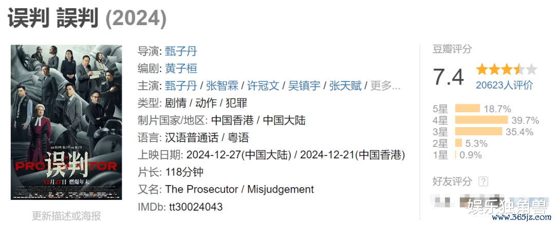 猫眼、华策主控,最高检影视中心市欢,甄子丹自导自演的港产主旋律电影《误判》,本于12月27日上映,但鉴于连年港片票房欠安,档期竞争压力大,该片“左手法律,右手拳头”,提前十余天开启点映。