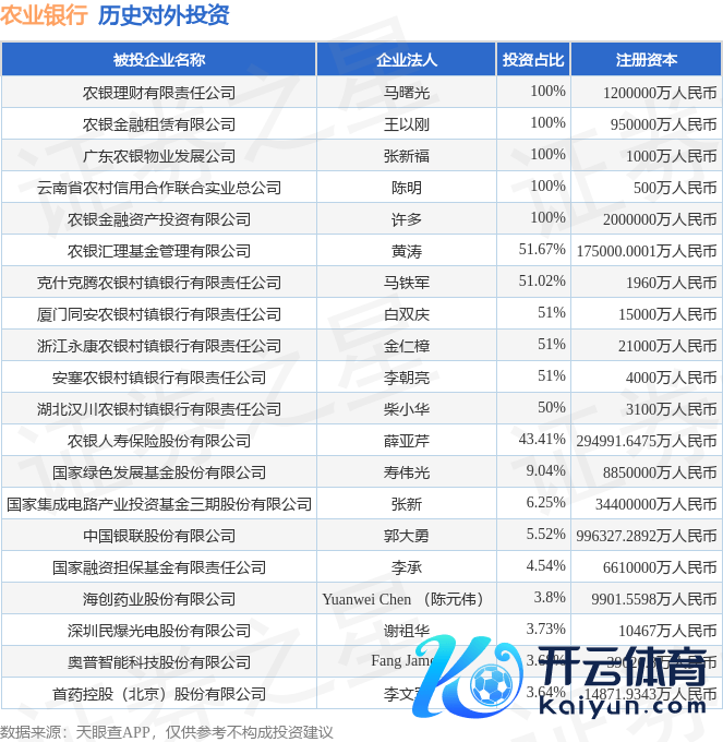 本站音书,凭据天眼查APP显现,农业银行(601288.SH)新增通盘对外投资事件,被投资公司为重庆山外山血液净化技能股份有限公司,法定代表东谈主高光勇,投资占比为1.61%。该公司从事专用建树制造业,注册老本为32131.5646万东谈主民币。现在,农业银行共存在对外投资833项,投资占比前20的技俩见下表: