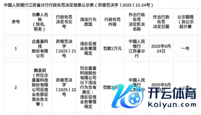 10 月 9 日,中国东谈主民银行江苏省分行以"违背征信业务不息律例"为由,对企查查处以 1 万元罚金,联系业务负责东谈主亦被处以 300 元个东谈主罚金。这笔鲜艳深嗜大于经济深嗜的罚单,突显企查查在合规搞定方面的轨制软肋与危险。