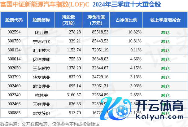 富国中证新动力汽车指数(LOF)C为指数型-股票基金,笔据最新一期基金季报披露,该基金金钱建树:股票占净值比94.73%,债券占净值比0.57%,现款占净值比4.8%。基金十大重仓股如下: