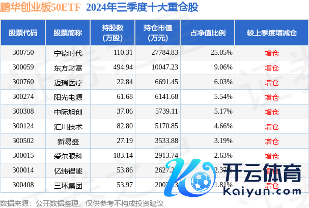鹏华创业板50ETF为指数型-股票基金,证实最新一期基金季报显现,该基金财富成就:股票占净值比97.86%,无债券类财富,现款占净值比0.85%。基金十大重仓股如下: