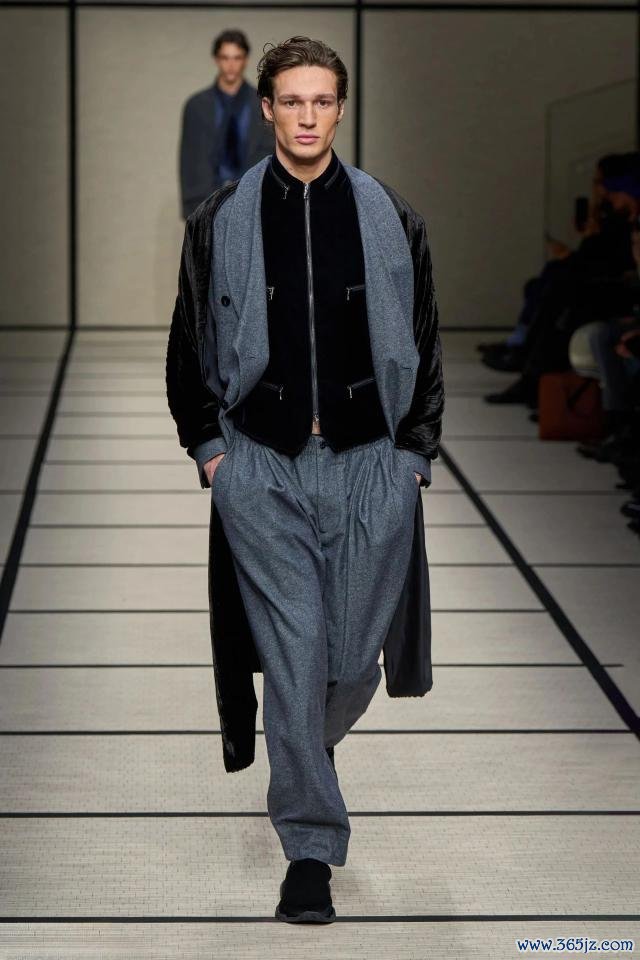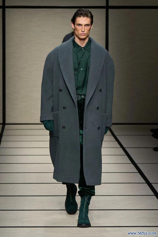 模特身着柔滑结构的大衣,当然垂感与宽松廓形拉近了绅装与体魄的距离,而天鹅绒花呢与舟师夹克则为举座带来视觉上的蔼然与质感。