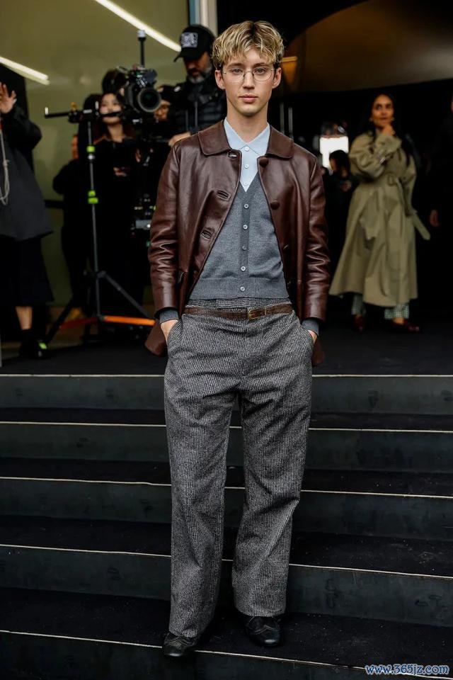 以 Troye Sivan 借 Prada 秋冬舞台呈现的造型为例:巧克力棕皮质大衣遮掩灰色开衫和羊毛长裤,衬衫扣到最顶,配上一副圆框眼镜——这是学院般的千里默魄力,却又在外衣的硬朗详细里赓续绅装的体面,这种相聚酿成了一种特有的好意思学张力。
