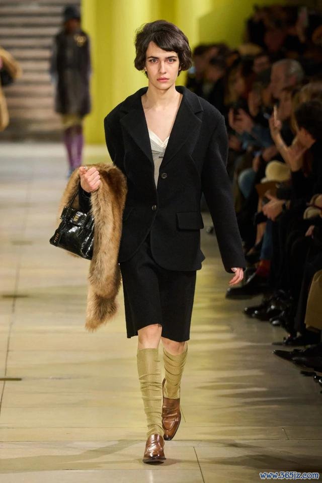 这一趋势在 Miu Miu 近两季的男装演绎中相同明白可见——计算师通过将修身剪裁的羊毛西装外衣与略带任意感的诚笃开衫、条纹衬衫叠穿,辅以丝质领带和圆框镜,刻意搪塞了名流与书卷气的鸿沟。