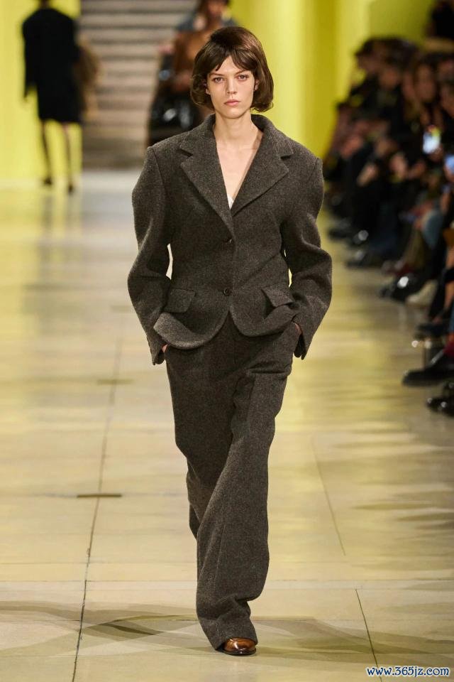 在 2025 秋冬系列中,致使出现了以传统双排扣大衣搭配学院风毛衣背心和闲适长裤的造型:上半身的挺括与下半身的松动酿成反差,让不雅众在刹那间感受到知性与优雅的同步开释。