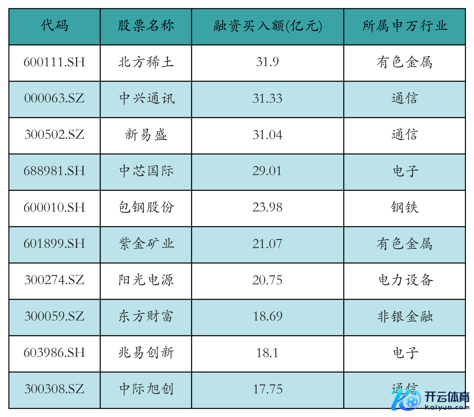 两市共有3446只个股有融资资金买入,其中朔方稀土、中兴通信、新易盛排行前三,买入金额分手31.9亿元、31.33亿元、31.04亿元。融资买入额前10个股笃定见下表: