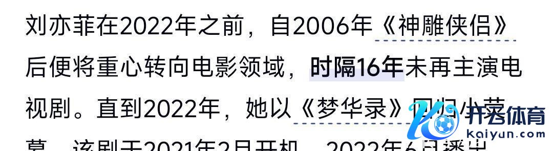 2008年刘亦菲在拍摄电影《功夫之王》后,因拒签华谊伯仲的签约,整整16年莫得踏足电视剧,
