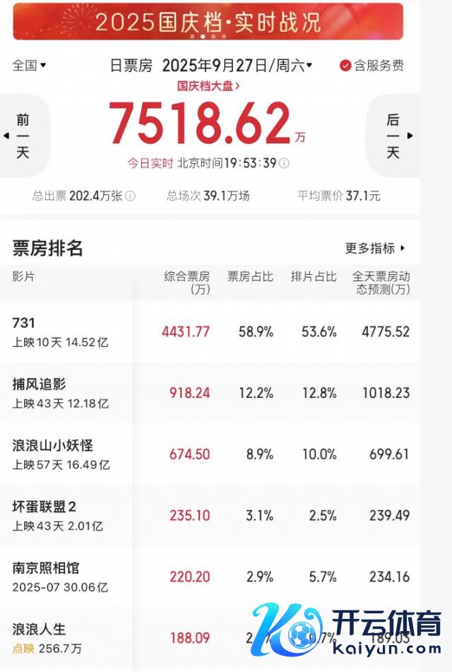 本周末,莫得新片上映,群众都在为行将到来的国庆档期作念准备,今天的票房只是只好 7518 万的得益,而一部《731》就拿走了 4000 多万。
