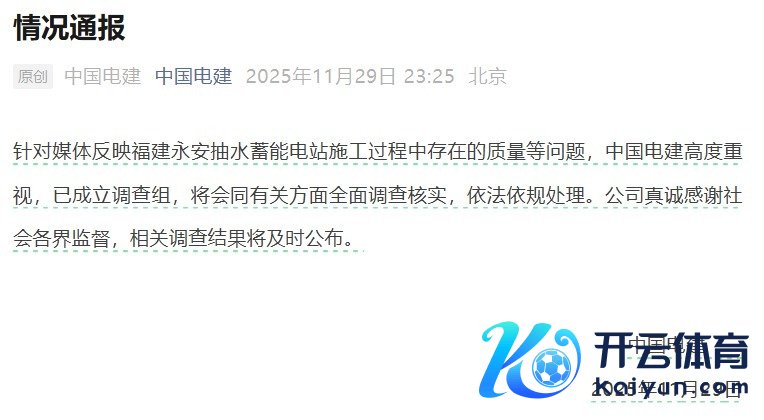 11月29昼夜深,中国电建发布情况通报,回复媒体反应福建永安抽水蓄能电站施工历程中存在的质地等问题。中国电建称,公司对该事件高度深爱,已诞生探望组,将会同相关方面全面探望核实,照章依规惩办。相关探望恶果将实时公布。