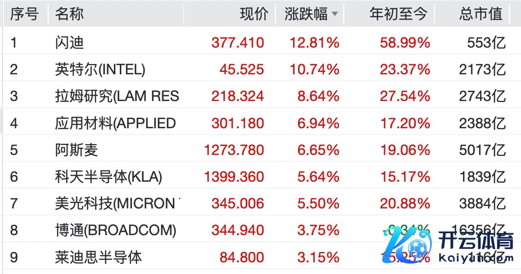 芯片股方面,英特尔涨超10%,闪迪涨近13%,拉姆酌量、运用材料、阿斯麦涨超6%,好意思光科技涨逾5%,股价创收盘新高。